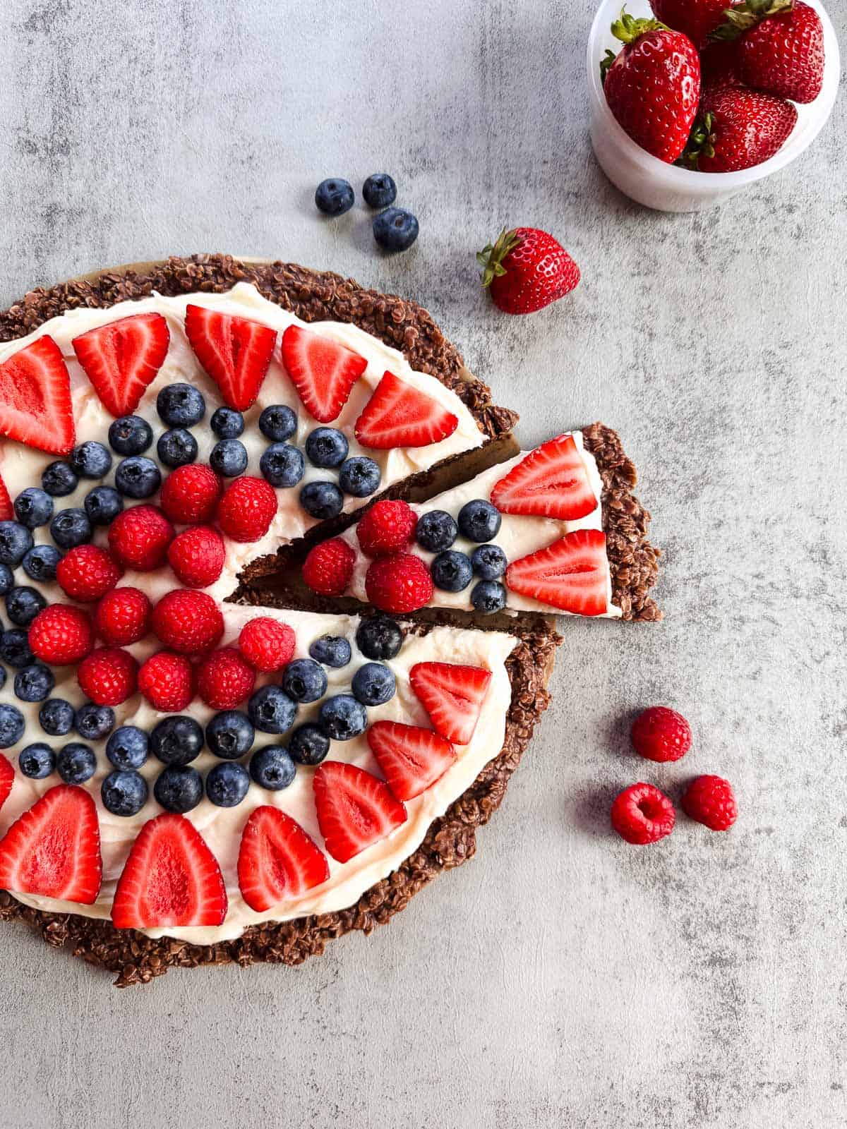 Love this spin on fruit pizza with a no bake crust! The combination of the fresh berries with the chocolate oatmeal crust is so good!